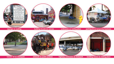 From left to right, top to bottom: Signage as seating. Building facade as canvas. Underpass as resting place. Parking lot as temporary business. Vacant lot as skatepark. Sidewalk as public podium. Highway underpass as skatepark. Building recess as resting place.