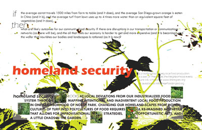 homeland security looks at local deviations from our industrialized food system through mapping intentional and inadvertent local food production in one neighborhood of North Park. Changing our homeland-scapes from monocultures of lawns into polycultures of food requires a re-imagined aesthetics that allows for improvisational strategies, opportunistic acts, and a little chaos in the garden.