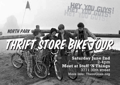 Join artists Joy Boe and Josh Bellfy on a leisurely community bike ride touring thrift stores in the North Park neighborhood. Meet at Stuff N Thangs Thrift store (3771 30th St, next to Saguaros - map) at 2pm with your bike/ scooter/ moped/ unicycle or wheeled object of your choice. The tour will end at Art Produce on University between 4 and 4:30pm.